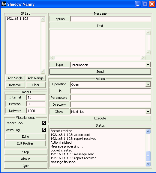 Shadow Nanny v2.0 Copyright (C) 2007 Anton Smolin aka "Gabriel Rage". All rights reserved. Shadow Nanny is mass remote control software, which gives you great abilities to control hundreds of computers! With this utility easy to shutdown many computers at one time! Or you may send informative messages over your network, check if computer is online and more other things! Parameters: IP List: list of IP addresses of computers for which selected operation will be executed, you can add single IP, add range of IPs, remove IPs or clear full list. Timeout: there are three types of timeouts: "Internal" - timout on client between operations, "External" - timeout on server before processing operation, "Network" - network timeout for sending and receiving commands. Miscellaneous: "Report Back" - if this flag is set, server will report back on receiving operations. "Write Log" - if this flag is set, "log.txt" file will be written. "Echo" - this operation checks all addresses in IP List and gives you information on current active computers. "Edit Profiles" - with this operation you can create new, delete, load and save profiles - files with your own parameters selected. Message: "Caption" - caption of the message "Text" - text of the message "Type" - icon of the message "Send" - sends message on all addresses in IP List Action: "Operation" - file operation "File" - file name "Parameters" - file parameters "Directory" - file directory "Show" - show method of executing file "Execute" - send execution command on all addresses in IP List Stop: stops all active operations This program is very useful for system administrators to advance their work on large networks. Server: size: 24,064 bytes port: 50000 UDP Tested on Windows XP October 29, 2008MegaSecurity