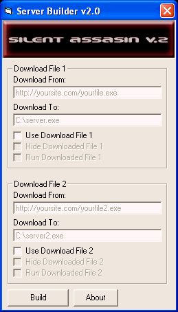 Silent Assasin v2.0 BETA ----------------------- -A quick little web downloader in c++ -The editor was coded in vb -Joint project coded by Saera1 & i2av -3 kb uncompressed server Features ----------------------- -55 character url -50 character CUSTOM path (C:\server.exe or w/e) -download 2 files (maybe more later...) -choose to hide/show file (both files) -choose to execute the file or not (both files) -threaded -fwb (Firewall bypass) Zonealarm, and Sygate Pro Saera1 Server: size: 3,072 bytes startup: none tested on Windows XP August 22, 2005MegaSecurity