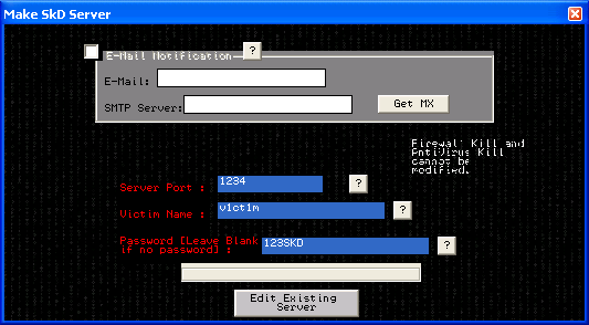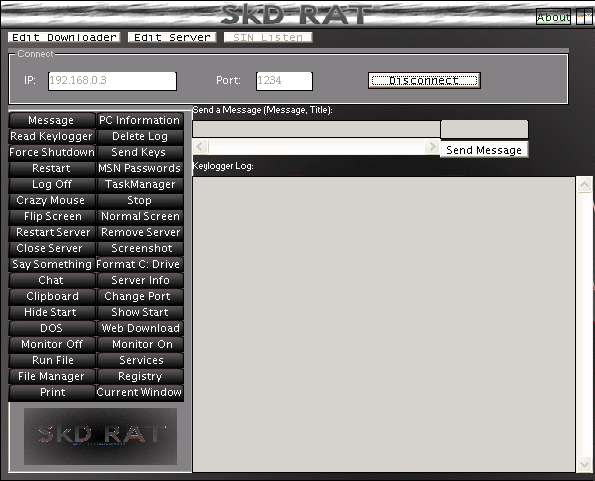 Some thing's you have to know: -Remember to RESTART Server before disconnecting because you may have problem's in connecting to the server again. -Use E-Mail Notification to know when the victim is online and his IP address to connect to. -After version 0.6, Screenshot function stopped working properly. -Services manager is underconstruction. -After packing the edited dloader.exe, size may be around 10 KB. -Do not pack the template server and downloader .exe's. -After packing the edited server .exe, you may encounter problem's with E-Mail notification. -The server uses MsWinsck.ocx after version 0.9, it installs the .ocx and a MSN Password grabber.[ That's why the server has such a big size ] . SkD Server: dropped files: c:\templog.txt Size: 103 bytes c:\WINDOWS\eimsn.exe Size: 57,344 bytes c:\WINDOWS\system32\rewt\servertemplate.exe Size: 446,464 byte port: 1234 TCP startup: HKEY_CURRENT_USER\Software\Microsoft\Windows NT\CurrentVersion\Windows "load" old data: new data: C:\WINDOWS\system32\rewt\servertemplate.exe HKEY_CURRENT_USER\Software\Microsoft\Windows NT\CurrentVersion\Windows "run" data: C:\WINDOWS\system32\rewt\servertemplate.exe tested on Windows XP June 06, 2005MegaSecurity