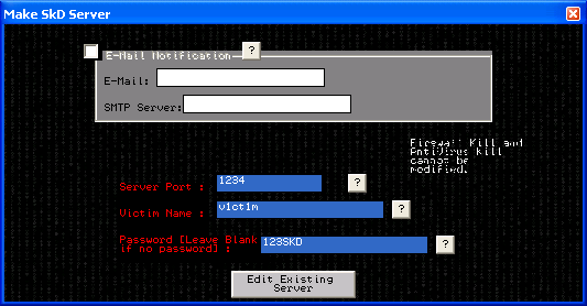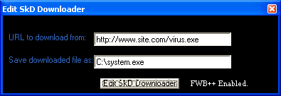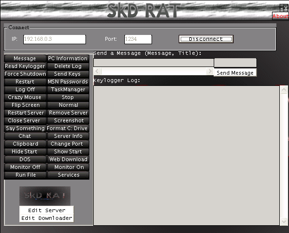 Some thing's you have to know: -Remember to RESTART Server before disconnecting because you may have problem's in connecting to the server again. -Use E-Mail Notification to know when the victim is online and his IP address to connect to. -After version 0.6, Screenshot function stopped working properly. -Services manager is underconstruction. -After packing the edited dloader.exe, size may be around 10 KB. -Do not pack the template server and downloader .exe's. -After packing the edited server .exe, you may encounter problem's with E-Mail notification. -The server uses MsWinsck.ocx after version 0.9, it installs the .ocx and a MSN Password grabber.[ That's why the server has such a big size ] . SkD Server: dropped files: c:\WINDOWS\eimsn.exe size: 57,344 bytes tested on Windows XP June 08, 2005MegaSecurity