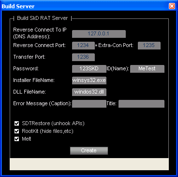 Well, this is my new version of my RAT. I think there are lots of changes since the last version (1.5)! The server is rewritten completely in a different language (Delphi), meaning that you dont need the Visual Basic runtimes anymore, and no more WinSock OCX is needed as Im using the WinSock API. This version is completely based on reverse-connection which makes the server connect to your computer instead of you connecting to a remote computer (direct connect). Here is a list of what my RAT currently features: -FireWall ByPass (Tested on ZoneLabs ZoneAlarm 6.0) -SDTRestore (Unhook Kernel+User Mode APIs) -In-Built RootKit (Hide Files,etc) -Server Multi-Threaded (While Downloading, you can do other functions!) -Registry Manager (More like a Registry Viewer as there is no delete,create,edit keys..) -Services Manager -MessageBox -URL Download -Mouse Control -Control Panel -Crazy Mouse -Send Keys -Power Options (Log Off,ShutDown,Reboot..) -MsN Passwords (Grab passwords for MSN messenger,Yahoo! messenger,ICQ,etc) -Offline/Online Keylogger -Window Manager -Task (Process) Manager -Hide StartButton/Show StartButton -Scripting -FileManager -ClipBoard Manager -PC Information -Mass Download (Send a command to all servers on your reverse-connected list to download a file + execute from any URL) SkD Server: dropped files: c:\WINDOWS\windos32.dll Size: 50,176 bytes c:\WINDOWS\winsys32.exe Size: 34,304 bytes c:\WINDOWS\system32\win32system.dat Size: 135 bytes port: 1234 TCP startup: HKEY_LOCAL_MACHINE\SOFTWARE\Microsoft\Windows\CurrentVersion\Run "Windows32Bit Service" data: C:\WINDOWS\winsys32.exe tested on Windows XP June 06, 2005MegaSecurity