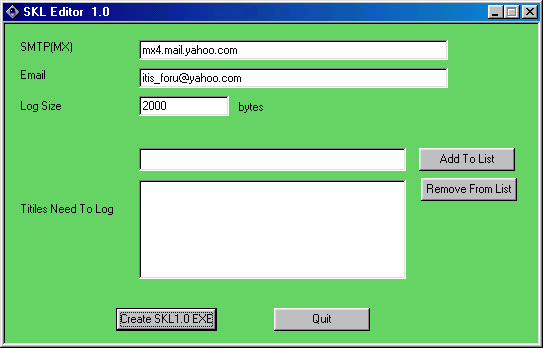 SKL 1.0 ----------------- Features 1)Targetted keylogging(logs only the keys from the specifyed windows) 2)keystrokes will mail to the email id,daily or the log size is over 3)firewall bypassing by injecting code into IE and sending mail 4) Deleting all Cookies at installation. 5) EXE size is 8.5kb 6) we can create the our own keylogger using the editor,we can specify the window titiles (the keys need to log),our email id,smtp server,log size) working -------- open the editor ,fil lthe details ,click the create skl1.0.exe ,u wil lget the keylogger exe,run it on the victims system and u will get all the keys daily or log file size over,to ur email id it will log only the keys of the specifyed windows, for example to log all the keys typing in internet explorer just give the internet explorer at the text box and click add to list then the logger will log all keys typed in IE it is not case sencitive,it just chek that string is present inside the window ,and if present it will log the keys b1ackh0le Server: dropped files: c:\WINDOWS\regog1.dll size: 0 bytes c:\WINDOWS\regog2.dll size: 0 bytes c:\WINDOWS\SYSTEM\kernel32.exe size: 8.713 bytes c:\WINDOWS\SYSTEM\regobj64.dll size: 8.192 bytes startup: HKEY_LOCAL_MACHINE\Software\Microsoft\Windows\CurrentVersion\Run "Services" data: C:\WINDOWS\SYSTEM\kernel32.exeMegaSecurity