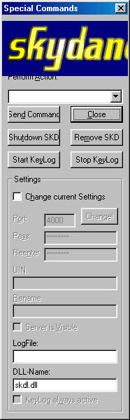 [email protected] Skydance Version 2.291 Beta Release -> nEWSET vERSIONS : goto http://skd.box.sk - USE SKYDANCE AND IT`S COMPONENTS ON YOUR OWN RISK - Read this First! Introduction: This Program is FREEWARE! SkyServer is a component of Skydance! Skydance is designed to control other Win95/98/NT systems in tcp/ip-nets like Internet and Intranets. I suggest you only use it on Systems you own/administrate. ;) Skydance 2.291 Beta Release is a program that will remain "under construction" and i will NEVER be responsible for any HARM or harmfull things that happend because SKYDANCE was USED! That means I do NOT guarantee for any features and security-thing and i do not guarantee that this program works proper!!! Indeed i guarantee for nothing ;) After these hard words... Do not harm, help people! Known Bugs: the treeview does not get updated automatically... maybe next time :) When updating the server you must reboot the server twice until you can delete the temporary server file New features in SKD 2.291: Bugs fixed! Use Update Button to put new version ono pc ;) New features in SKD 2.29: This is mostly an update! 2.25 has the problem that server is not hidden from tasklist. Update Button: This new feature can be used to easily update an old server. New features in SKD 2.25: ICQ support ->Specials-Button: add your UIN and then Set the new settings! The Icq-pager will send the ip 20 seconds after dial-in! RegEditor ->RegEdit-Button Enables you to Request and set Registry information (f.e. Windows CD-key (no DWORD/Binary yet)) RemoveServer-function ->Specials-Button: Press to remove SkyServer Registry Data from server. Be Aware... you are resetting all! so check other settings, too The Icq-pager will send the ip 30 seconds after dial-in! there seems to be several providers that do not support this function. i do not know why. General features: KeyLog-function! (still a bit buggy but does most of its job...) RemoveServerRegistryData Good administration of files on the server. server-client communictaion-window that list you all events. ICQ-Pager RegEditor Reboot/Shutdown Server Swap Mous-Buttons and some jokes Execute Files Download/Upload MessageBox Task-Viewer/Manager Access to all HDs even Network-HDs Password-Protection Visible/Invisible Server FAQs: -Some people asked me if there is a master-password in the application... no! there is NO MasterPassword! -Some called Skydance a Trojan Horse. Anyway, it depends what you are going to do with it. >Usually WE use it to administrate servers on lan-partys! -Some asked how to use a vbs (VisualBasicScript). All you need to do is to use the wscript.exe in your <windir> -Some asked... NO, IT IS NOT WRITTEN IN VB, it is C++! -AND SOME ASKED: MAY I HAVE THO SOURCE-CODE PLEASE ? Respond: BlaBla BLAAA blabal BLUB! Howto use the Keylog-function: >>>> If you want to use the KeyLog, you must upload the "skd.dll" to the directory where skd is in or to the >>>> <windir> or just to the specified directory. In addition to that you need to set the LogFileName and >>>> the Dll-FileName in "Specials" of Skydance-Client... Howto open a music/txt/something file: For example to run a mp3 do something like this: in the run-command-line: c:\program files\windows mediaplayer\mplayer2.exe d:\mp3\MathRules.mp3 <executable-program> <data-file> Howto use a vbs on server: get and find wscript.exe in server�s windir (usualy c:\windows\wscript.exe) then simply run: <windir>\wscript.exe <full vbs-path> HowTo Install Server: All you have to do is to start "SkyServer" these things are performed then:(probably only win95/98/Me) -a copy of SkyServer will be done in <windir>\skd.exe -Registry-Entrys -Standards: Pass=Skydance, Port=4000, Dialog=invisible ! be aware, Skydance will now be run every time you restart windows! Deleting the file will stop it, of course(the <windir>\skd.exe )!!! Do never harm people! HowTo Use Client: just connect by using correct ip+port and pass. In Menu: "Updated Mode" Updated every time when clicking on a tree; "Discovery Mode" will load the dir/files only one time. "Stealth Mode" will not open unloaded dirs. (So HD will become more silent) ContextMenu: CopyPath can be used to get the path of an exe/com and than you can combine it with execute... Download/Upload: all files you transfer will be added. That means if file allready exists, the data you receive will be APPENDED!!!!!!!! mail me and tell me if it works fine? Run: As it says Specials: use Specials to configure SKD 2.0! set password, port and KeyLog etc. Decide if server is visible or not Shutdown the server by using "Shutdown Server" ;) "name" renames the server-file (<windir>\SKD.exe) to a new and updates registry! the server is copied to the specified < dir\name.exe > use a exe NAME!!!! the running server-file will still exist! delete it later(next time server is run, usually after a reboot)! Tasks: it is similar like the usual task-list of win95/98... there are some windows shown you should not close. For example Task Manager is your Task-Bar ;) You should create a directory c:\skd2\ for downloads, on your system! Be Aware, all you are doing is no joke! do not access systems without permission. For example to run a mp3 do something like this: in the run-command-line: c:\program files\windows mediaplayer\mplayer2.exe d:\mp3\MathRules.mp3 Thx for reading, and now have fun, Edrin Client: added to registry: HKEY_CLASSES_ROOT\.sky "(Default)" data: NewCon.Document HKEY_CLASSES_ROOT\.sky\ShellNew "NullFile" HKEY_CLASSES_ROOT\NewCon.Document "(Default)" data: NewCon Document HKEY_CLASSES_ROOT\NewCon.Document\DefaultIcon "(Default)" sata: C:\WINDOWS\DESKTOP\SKYDAN~1.25B\SKYDAN~1.EXE,1 HKEY_CLASSES_ROOT\NewCon.Document\shell\open\command "(Default)" data: C:\WINDOWS\DESKTOP\SKYDAN~1.25B\SKYDAN~1.EXE "%1" HKEY_CLASSES_ROOT\NewCon.Document\shell\print\command "(Default)" data: C:\WINDOWS\DESKTOP\SKYDAN~1.25B\SKYDAN~1.EXE /p "%1" HKEY_CLASSES_ROOT\NewCon.Document\shell\printto\command "(Default)" data