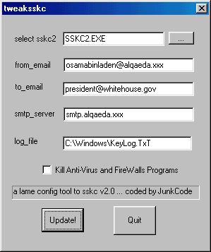 SSKC v2.0, is a keylogger with SMTP support. Its logs key typed in all