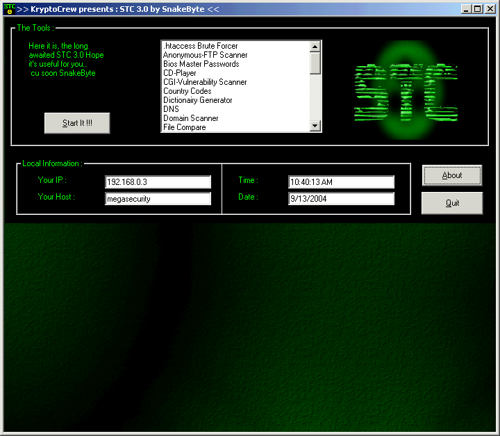 What's new in STC 3.0 ? Get Netbios LAN Passes Cracker improved .htacces Brute-Forcer CD-Player CGI-Scanner scans for 241 vulnerabilities and is faster Country Codes Dictionairy Generator Get Cached Passwords IRC-Channel Bruteforce Link Looker Password Generator Ping/Traceroute Port2Service SnakeByteMegaSecurity