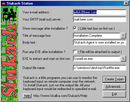 Stukach is a tiny little program, which can run hiddenly on some computer, keeping track of everything user types on the keyboard, and sending this information to you via e-mail. Of course, user never would know you are reading his e-mail and stuff, unless you would say him. Iskalkin Server: dropped file: C:\WINDOWS\SYSTEM\sysreq.exe size: 49.152 bytes port: 25 TCP startup: HKLM\Software\Microsoft\Windows\CurrentVersion\RunMegaSecurity