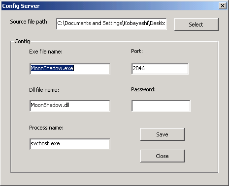 Server: dropped files: c:\WINNT\system32\MoonShadow.dll Size: 263,836 bytes c:\WINNT\system32\MoonShadow.exe Size: 311,296 bytes added to registry: HKEY_LOCAL_MACHINE\SOFTWARE\Microsoft\Windows NT\CurrentVersion\Winlogon "Shell" old data: Explorer.exe new data: Explorer.exe MoonShadow.exe HKEY_LOCAL_MACHINE\SYSTEM\ControlSet001\Services\SharedAccess\Parameters\FirewallPolicy\StandardProfile\GloballyOpenPorts\List "2046:TCP" data: 2046:TCP:*:Enabled HKEY_LOCAL_MACHINE\SYSTEM\CurrentControlSet\Services\SharedAccess\Parameters\FirewallPolicy\StandardProfile\GloballyOpenPorts\List "2046:TCP" data: 2046:TCP:*:Enabled tested on Windows 2000 September 01, 2005MegaSecurity