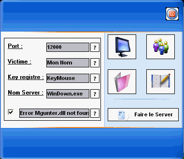Server: dropped files: c:\webcam.ocx Size: 26,624 bytes c:\WINDOWS\system32\ijl11.dll Size: 180,224 bytes c:\WINDOWS\system32\WinDown.exe Size: 524,288 bytes port: 12000, 26874, 26878, 5555 TCP startup: HKEY_LOCAL_MACHINE\SOFTWARE\Microsoft\Windows\CurrentVersion\Run "KeyMouse " data: C:\WINDOWS\system32\WinDown.exe tested on Windows XP June 04, 2005MegaSecurity