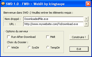 - Builder - FWB++ webdownload, inject into the default browser - Dynamic linking for API's use ( there's NO "dangerous" API in the IAT / Import Table, mainly "GetProcAdress" / "GetModuleHandle" ).. in fact, there's no static buffer's in the server, everything is done with stack. - Choice of target directory : System32, Windows, Temp - Choice of run it or not after download the file - Choice of the webdl melt' or not - Choice of the filename after download ( name a file "file1.Exe" on your website, you can choose to save it under "csrss.exe" after download it at target .. ) - Encryption of settings ( Two very, very, very simple cryptage, one for each setting : One for the URL, another one for the FileName ) - URL length of 240 char. available, Filename => 30 char. Icingtaupe Server: size: 3,072 bytes tested on Windows XP July 10, 2006MegaSecurity