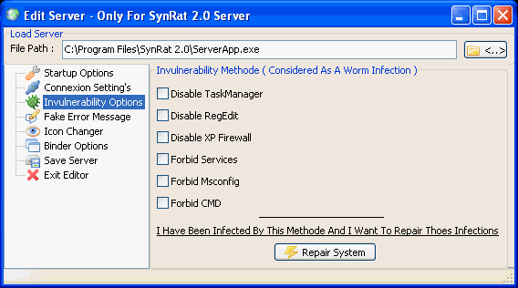 Server Dropped File: c:\WINDOWS\Server.exe Size: 192,720 bytes Startup: HKEY_LOCAL_MACHINE\SOFTWARE\Microsoft\Windows\CurrentVersion\Run "DarkCoderSc" Data: C:\Windows\Server.exe Tested on Windows XP October 26, 2008