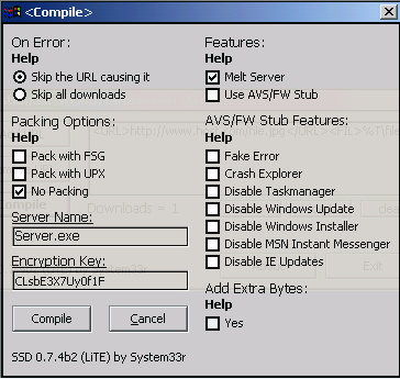 * Main Features * - Melt Server - Extreme FW/AV Kill (Over 800 AV/FW in the list!) - Encryption - Fake Error Message - Small 32kb unpacked, with all options enabled (FW/AV kill, Melt, URLs etc) - Ability to pack with either fsg or upx! - Server has good Error Handling - Easy to-use GUI (Small support for Skins.) - If UPX packing is specified it also scrambles the Server =) - If it cannot kill a process it operates silently without errors - Runs in the background (Hidden from taskmgr etc) - Ability to define wether downloads should be executed hiddenly, visible or don't execute at all - Undetected from ALL anti-virus software! (I hope) - Support for MANY downloads! * v0.7.4b2 (LiTE) changes: * - Undetected - Minor GUI Changes. I don't like it. - Removed Some Sounds System33r Server: size: 10.893 bytes (unpacked)MegaSecurity