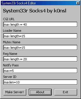 Features: - Subseven CGI Notification - Dynamic DLL Injection - Small ASM Loader - C Stub - Some Settings are Encrypted - Server Builder is Compiled in Visual Basic 5 - Small Server Size. 9kb Compressed (UPX: latest unstable) KAV doesn't show the server as being packed when packing it with these parameters: %upxdir%\upx --best --all-methods --all-filters %EXE% This version (v0.0.3) is STABLE. All features in the Editor is editable and it works 100% this far. Thanks a bunch to r3l4x for making the Editor! The server editor will be given new GUI at the next release, but right now i am focusing on improving the socks4 server. The Server Builder (editor) has no error checking whatsoever, use common sense. When i did beta testing on unsuspecting victims KAV tagged it as TrojanNotifier Win32 Haxor hehe but now they gave it this lame tag indicating that it also was made in Visual Basic which is very misleading. In the next release i might include Static IP Notification, and probably more stuff! ANY bugs found can be sent to k0nsl@msn so i can mend them for future release! Use Advanced Process Manipulation by DiamondCS (http://diamondcs.au.com) to remove the DLL, or boot into safemode and remove it that way. SS4 version 0.0.3 Changes: Cleanup in DLL Loader (Planning complete rewrite in C++) Added more Debug messages in the Socks DLL Sends only CGI Notification if User is Online k0nsl Server: size: 19.456 bytesMegaSecurity
