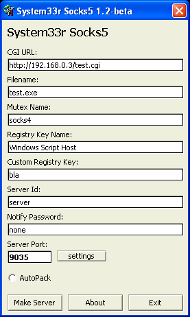 System33r Socks5 v1.2-beta by System33r ([email protected]) System33r Socks5 is a socks5 server with a 'trojan'-like behaviour (extremely stable) Main Features: - SubSeven CGI Notification - Installation Routine (copies itself to sysdir/drivers/filename.exe, and adds registry entries) - If Registry entries are deleted the server adds them again - deleteself (melt) - identd - custom registry key (eg. Software\\Microsoft\\Windows\\CurrentVersion\\Policies\\Explorer\\Run) - small size: 4,kb ( 7,kb unpacked) - included my slightly modified Sub7 CGI Logger - editor remembers your settings - it's horribly stable Added in v1.2: - option to send LAN notifications, or not send such notifications to the CGI, as requested by some people - installs itself into the SystemDirectory to the folder 'drivers' - added a DLL 'payload' which is extracted to the SystemDirectory and runs the socks5 server if not already running - DLL 'payload' adds itself for autostart as an Explorer Addon (ntldr32.dll) System33r Server: dropped files: c:\WINDOWS\system32\ntldr32.dll size: 2.560 bytes c:\WINDOWS\system32\drivers\test.exe size: 5.361 bytes port: 113 TCP startup: HKEY_LOCAL_MACHINE\SOFTWARE\Microsoft\Windows\CurrentVersion\Run "Windows Script Host" data: C:\WINDOWS\System32\drivers\test.exe tested on Windows XPMegaSecurity