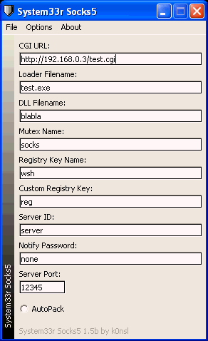 System33r Socks5 v1.5b by System33r ([email protected]) System33r Socks5 is a socks5 server with a 'trojan'-like behaviour (extremely stable) Main Features: - SubSeven CGI Notification - DLL injection with SRT library - Installation Routine (copies itself to sysdir/drivers/filename.exe, and adds registry entries) - If Registry entries are deleted the server adds them again - deleteself (melt) - identd - custom registry key (eg. Software\\Microsoft\\Windows\\CurrentVersion\\Policies\\Explorer\\Run) - reasonable size - included my slightly modified Sub7 CGI Logger - editor remembers your settings - it's horribly stable Additional information: - Server written in cpp - Loader/Injector in ASM - XOR routine by drocon Problems: - if you get a message 'stub not found' check the folder 'stub' and see if there are two files named 'stub1.old' and 'stub2.old', rename these to 'stub1.dat' and 'stub2.dat' or just open the Editor and click Options > Update Stubs and download a new set of server stubs. If you cannot download new stubs with the 'Stubs Updater' tool please post a message at the board where you got this tool or email me and I will give you instructions so you can change the 'update server'. Changes in v1.5b: - these new stubs does _not_ work with any of the previous editors (only use 1.5b editor or newer) - misc changes in the editor, tweaks and small fixes - changed meltserver routine in asm loader - minimalistic changes in the socks5 updater tool - rename pubsettings.ini to settings.ini if you dont want the editor to store anything in the registry, after you have renamed it run the editor and enter all the required fields (Options > Settings etc) since you cannot manually enter the username and password in the configuration file you must do it through the editor, everything else can be manually edited if you wish to do that. - the settings are not stored as plaintext anymore in the socks5 executable System33rMegaSecurity