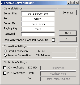 Theta is basically a 6.4 Kb cmd server. Might seem much for just a cmd server, but it's so big because of 9* compatibility (I mean injection, read technical details). What is a cmd server you ask? Well, it's a server, that enables you to have access to another computer's command prompt, which is often all you need, because from there you can do anything (providing you know basic DOS commands); you can even download and run a file from the Internet. Theta 2 key features: - it's written 100% in assembly (server and server builder), resulting in small file size, low memory print, and high speed. - it's not bloated by unnecessary features. - ability to password-protect a server - reverse connection (for servers installed on systems behind routers/proxys/etc). - it uses a injection method that isn't very common, so that, once installed, the server can not be removed, unlike the standard dll injection techniques you will find in most other RATs. - the server is highly configurable. - you can connect to your server from any operating system that supports TCP/IP and has a terminal. You can also use it as a back door to a back door, in case your other RAT gets detected/removed/whatever. Theta will make sure you always have access to the box. Requirements: The package (server and editor) will run without any problems on any 386 and up processor, with at least Win95, and Winsock 1.1 or higher. It accepts an unlimited number of clients, and features reverse connection, ICQ and PHP notifications. What's New in Theta 2 Theta 2 (compiled in August 2004 - released in October 2004) added reverse connection added password protection changed CGI notification to PHP improved some error handling and memory leaks other minor server tweaks Ghirai dropped file: c:\WINNT\system32\theta_server.exe size: 9.728 bytes port: 51086 TCP startup: HKEY_LOCAL_MACHINE\SOFTWARE\Microsoft\Windows\CurrentVersion\Run "theta" data: theta_server.exe tested on win2000MegaSecurity