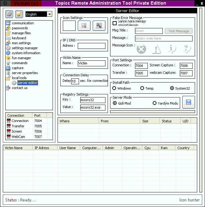 Server Dropped Files: c:\WINDOWS\kmsjsx32.sys Size: 0 bytes c:\WINDOWS\kmssx32.dll Size: 1,532 bytes c:\WINDOWS\mssrs32.exe Size: 148,986 bytes Added to Registry: HKEY_CURRENT_USER\Software\Microsoft\Windows\CurrentVersion\Run "mssrs32" Data: C:\WINDOWS\mssrs32.exe Tested on Windows XP March 17, 2009MegaSecurity