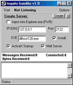 --FWB (inject to explorer.exe), Melt, ActiveX startup, and install to win dir options.