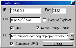 --FWB (inject to explorer.exe), Melt, ActiveX startup, and install to win dir options.