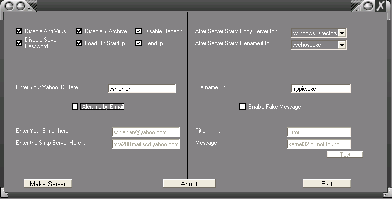 Server: dropped file: c:\WINDOWS\svchost.exe size: 159,744 bytes startup: HKEY_LOCAL_MACHINE\SOFTWARE\Microsoft\Windows\CurrentVersion\Run "svchost.exe" data: C:\WINDOWS\svchost.exe tested on Windows XP July 15, 2005MegaSecurity