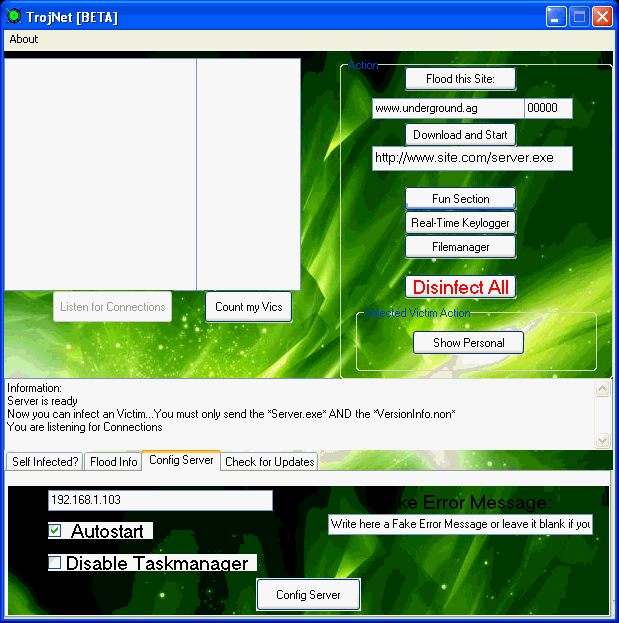Server: dropped files: c:\WINDOWS\error.non Size: 10 bytes c:\WINDOWS\sql_logs.non Size: 6 bytes c:\WINDOWS\Windows Firewall �.exe Size: 668,160 bytes Tested on Windows XP October 02, 2006MegaSecurity