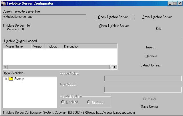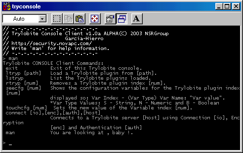 Trylobite is a complex engine for remote control , based on the last version of Back Oriffice 2000 ( v1.3alpha). I'm developing the small details of the "trojan" ( ok, yes , ok , it is a trojan but you can use a new plugin for make the server "visual" ) but i have completed the graphical interfaces and the server including a console version of the client. The plugins of BO2K are ully compatible with Trylobite but you need to recompile and modify some sections of the plugin , im going to write a document for explain this . Current Plugins, - Null Authentication Packets - STCP ;-) YEAH! ( TCP Secure Connections for encrypt the communication between server and client/master ) - UDP Networking ;-) - AES nc - Others The source code is not avalaible at the moment but im going to publish it in the future. Server: Size: 49.152 bytes port: 27853 TCPMegaSecurity