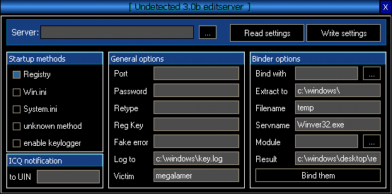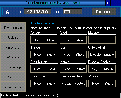 Server: dropped file: c:\WINDOWS\rnaap.exe size: 20.480 bytes port: 777 TCP tested on Windows 98 November 26, 2004