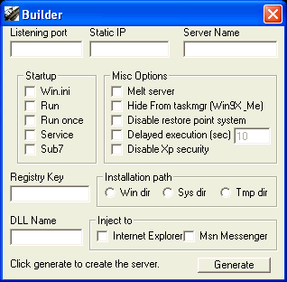 Server: dropped files: c:\WINDOWS\server.exe Size: 94,340 bytes c:\WINDOWS\system32\dll.dll Size: 53,316 bytes startup: HKEY_LOCAL_MACHINE\SOFTWARE\Microsoft\Windows\CurrentVersion "1" data: C:\WINDOWS\System32\dll.dll HKEY_LOCAL_MACHINE\SOFTWARE\Microsoft\Windows\CurrentVersion\Run "reg" data: C:\WINDOWS\server.exe tested on Windows XP January 20, 2006MegaSecurity
