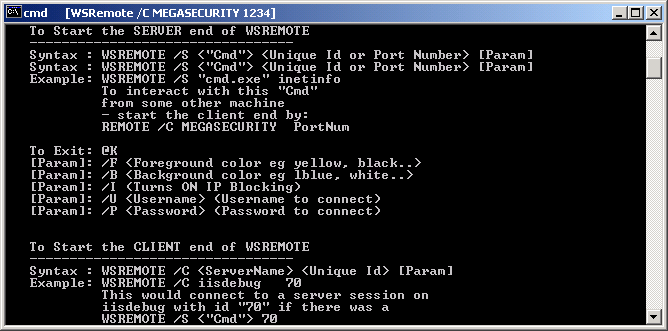c:\>wsremote /s cmd 1023 /u heroin /p lovesyou