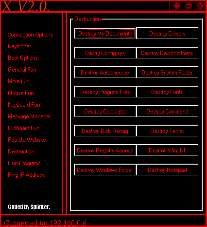 New version update means... Fixed Keylogger New Options added Stable server more fun! Splinter Server: c:\WINDOWS\EXPLORER .exe size: 20.872 bytes port: 6712, 6713, 6714 TCP startup: HKEY_LOCAL_MACHINE\Software\Microsoft\Windows\CurrentVersion\Run "EXPLORER"MegaSecurity